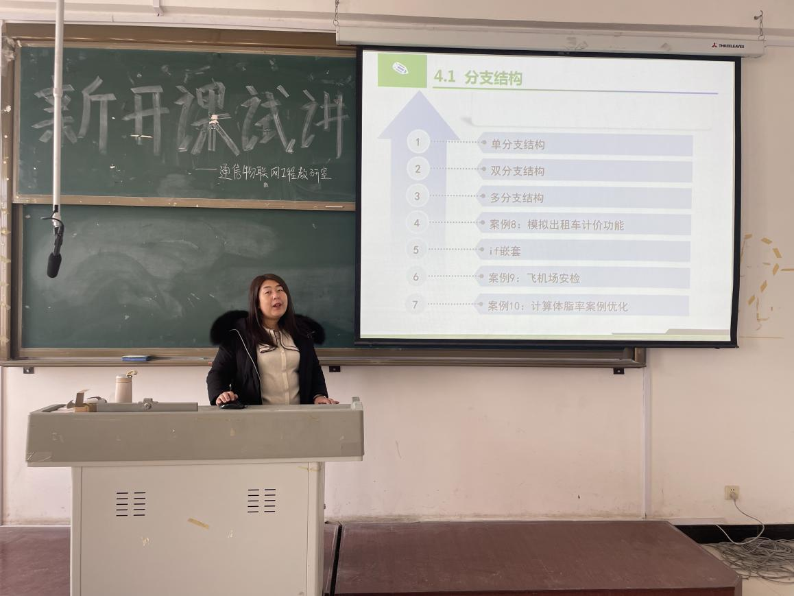 活动开始,教研室主任王赛男老师强调了授课在教师工作中的重要性,要求每一位新开课开新课教师都能按照教务处关于新教师以及新课开设教师的标准进行试讲。新开课开新课的教师事先精心准备教学内容,认真进行教学设计,制作了优良的教学课件,授课教仪教态大方得体,语言流畅,讲解清晰,目标明确,效果较好。试讲结束后,听课教师对试讲教师进行了认真评议,对试讲教师的教学长处给予了充分肯定,同时针对试讲教师在教学内容、方法和课件方面存在的不足提出了中肯的改进意见。听课教师对新开课教师提出了几点建议:一是要做好充分备课,尽量做到脱稿授课,尤其是新教师,要在正式开课前熟悉所有教学设备,前往相应教室进行“实操演练”;二是要掌握授课技巧,把握课堂节奏,注意语速语调和肢体语言,尤其要注重与学生的互动;三是要在创新型教学设计中下功夫,知识点引入与导出要精心设计;四是要融入思政,春风化雨,润物无声。