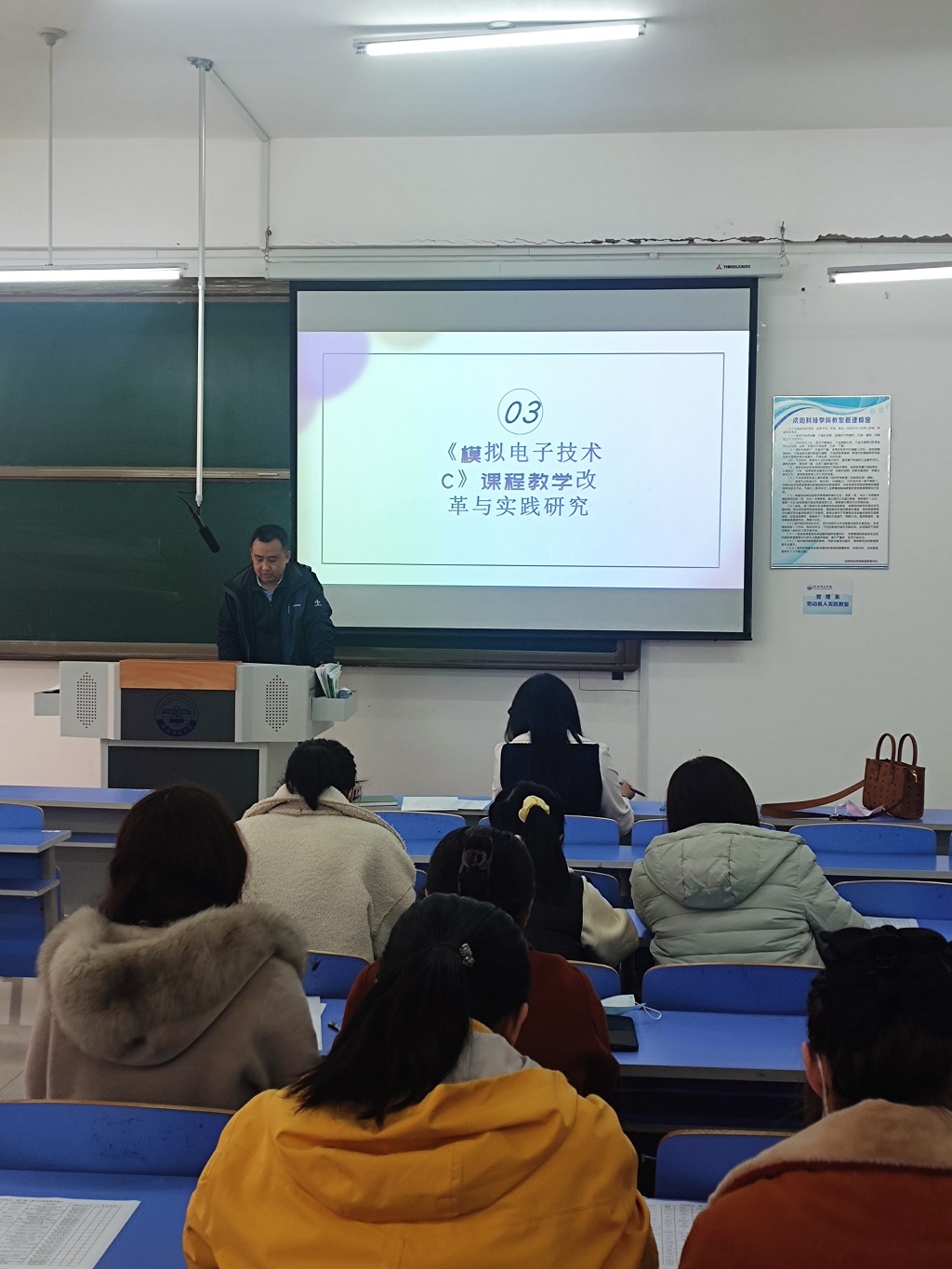 会议开始后,信息系杨倩、信息系孟显娇、信息系任艳、信息系王佳、信息系崔浩楠、信息系王赛男、信息系郭丹、信息系李雨薇、信息系王娜、信息系高皓老师等教师分别进行汇报,因受前3年疫情影响,单纯线下课不能把学生的课余时间很好的利用,创新创业活动和课程思政没有更好的融入。由于学生看不到学生版大纲,从而导致学生对课程的学习比较茫然。每位老师针对自己任教的课程进行混合式教学的研究与探讨,李雨薇老师针对《信号与系统》这门课,分析课程教学中的问题,从教学内容、教学手段等方面改革入手,并加强教学实践,以达到教学改革效果。高皓老师以《C语言程序设计》这一基础课程为背景,利用线上线下教学的优势,以学生为主导,老师为主体,利用慕课、学习通等网上教学平台,设计灵活、多样的教学方法,探索线上线下混合式教学新思路,激发学生学习的主动性和创新性,提升教学质量。杨倩老师对《模拟电子技术C》课程进行探讨,改变传统的“填鸭式”教学模式,实行翻转课堂、讨论法和参与式教学法等。孟显娇老师从《模拟电子技术》混合式教学模式设计,思政要素的融入,教学手段的完善、改革考核方式,利用仿真平台以及开展课外活动六个方面进行全面改革。郭丹老师以《面向对象程序设计》课程为例,主要研究如何根据课程的特点,制定一套科学合理、切实可行的课程实施机制,有效激发学习兴趣、挖掘学习潜能、提升学习效果。探索了该门课程线上线下混合式教学的课程改革机制。