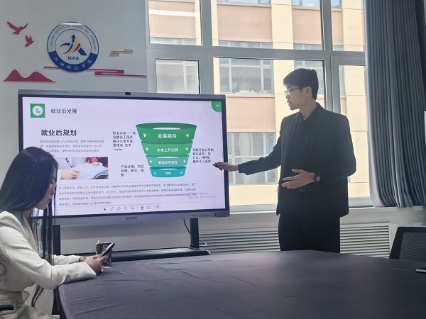 为备战3月7日的省级决赛,院系各级领导高度重视,组织多轮赛前指导。由就业处处长马丽、指导教师马诗瑶、领队杜美萱老师组成专项指导组,从职业定位、答辩逻辑到台风表现,全方位为选手提供针对性建议。决赛前,丛家研与指导教师马诗瑶,每日在会议室反复打磨讲稿、模拟答辩。应用"STAR模型",将职业定位拆解为情景(Situation)、任务(Task)、行动(Action)、成果(Result)四大模块。同时强化表达逻辑,提升陈述结构清晰度,克服紧张情绪,力求精益求精。最终,他在沈阳工业大学决赛现场,从容展示职业规划蓝图,以清晰的逻辑、自信的风采赢得评委认可,为校争光。
