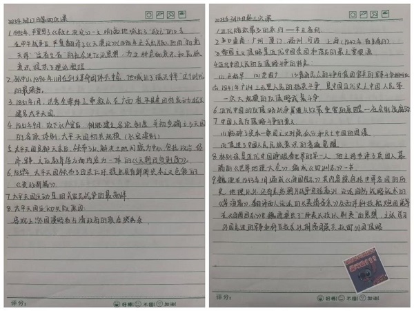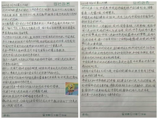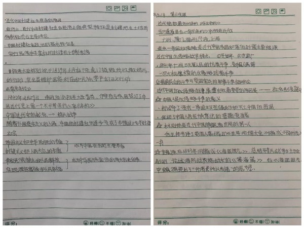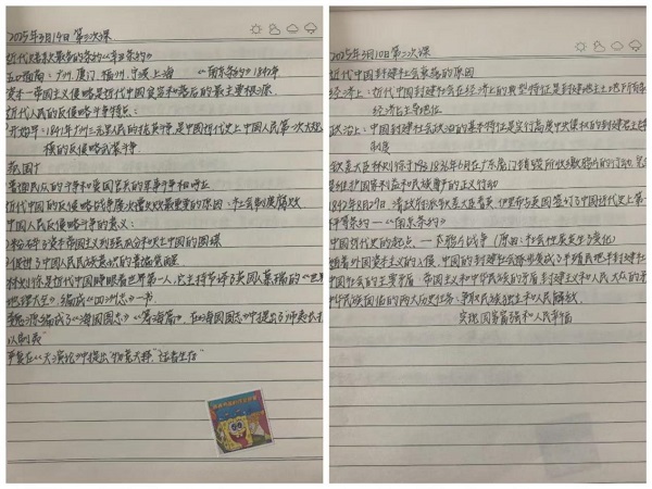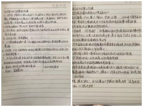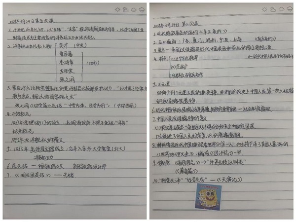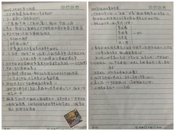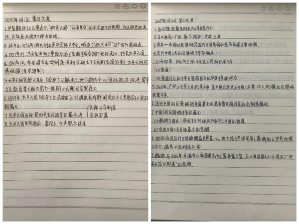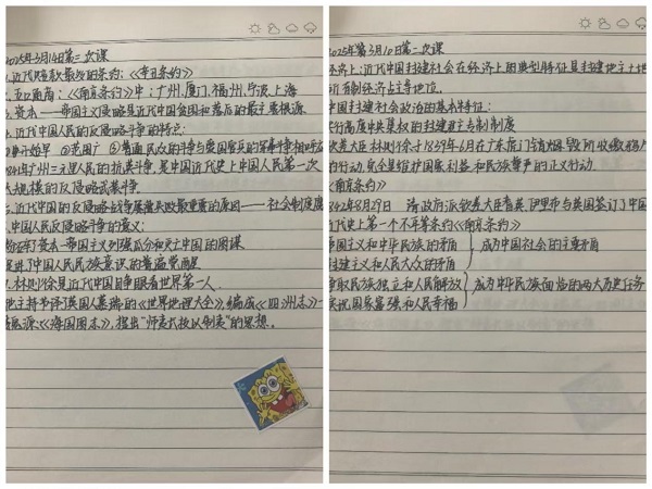 笔记形式丰富多样,彰显同学们的独特思考。有同学采用思维导图,以中国近现代史的核心主题为中心,向外延伸出各个历史阶段的分支,分支上还标注着关键事件、代表人物以及相互之间的逻辑关系 ,将复杂历史知识梳理得井井有条,方便记忆与理解。还有同学用手绘插图为笔记增色,画一幅栩栩如生的虎门销烟场景图,硝烟滚滚中林则徐的坚定神情跃然纸上,让原本枯燥的历史事件瞬间生动起来,加深对知识的印象。