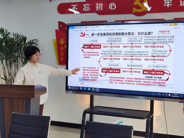 李俊辰老师表示,党的二十届三中全会再次强调了党的领导核心作用,以及坚持中国特色社会主义道路的重要性。必须始终保持高度的政治敏锐性和政治责任感,不断增强“四个意识”,坚定“四个自信”,做到“两个维护”。确保始终沿着正确的政治方向前进。努力成为学生的良师益友和人生导师。在未来的工作中,将继续努力学习、积极进取、勇于担当、敢于创新,为学校的发展贡献自己的力量。