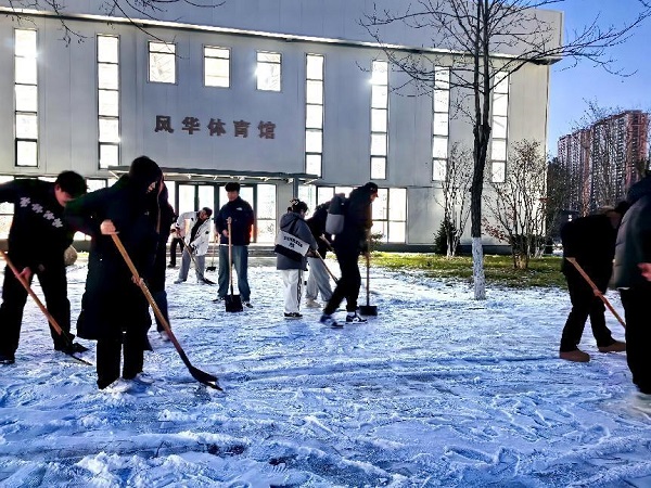 凛冽的寒风阻挡不了同学们的热情。扫雪活动开始后,大家积极地投入到活动中,学生党员们拿着铁锹来到了分配好的场地前,开始了清扫活动。虽然积雪比较厚,天气比较冷,但这并没有影响参与者的热情和工作效率。大家团结合作,以最快的速度将积雪清理干净。经过一个小时的艰苦努力,基本铲除了体育馆门前的积雪,消除了大雪天气导致的安全隐患,为师生的安全出行提供了方便。劳动的过程中充满了欢声笑语,每个人都乐在其中,扫雪队伍成为冬日校园一道亮丽的风景线。